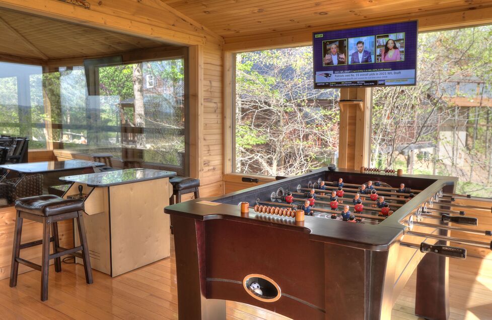 • Glassed in Room Off Living Room – Pool Table, Arcade, Foosball Table, Pub Table with seating for 4, 42” Smart LED TV